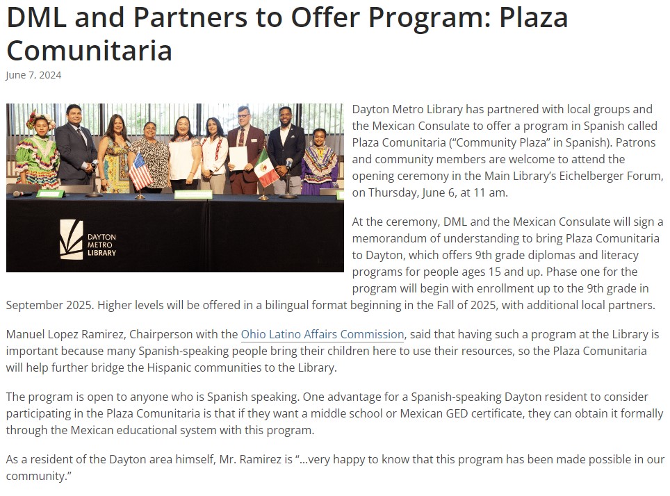 https://www.daytonmetrolibrary.org/news/plaza-comunitaria/ Dayton Metro Library has partnered with local groups and the Mexican Consulate to offer a program in Spanish called Plaza Comunitaria (“Community Plaza” in Spanish). Patrons and community members are welcome to attend the opening ceremony in the Main Library’s Eichelberger Forum, on Thursday, June 6, at 11 am. At the ceremony, DML and the Mexican Consulate will sign a memorandum of understanding to bring Plaza Comunitaria to Dayton, which offers 9th grade diplomas and literacy programs for people ages 15 and up. Phase one for the program will begin with enrollment up to the 9th grade in September 2025. Higher levels will be offered in a bilingual format beginning in the Fall of 2025, with additional local partners. Manuel Lopez Ramirez, Chairperson with the Ohio Latino Affairs Commission, said that having such a program at the Library is important because many Spanish-speaking people bring their children here to use their resources, so the Plaza Comunitaria will help further bridge the Hispanic communities to the Library. |